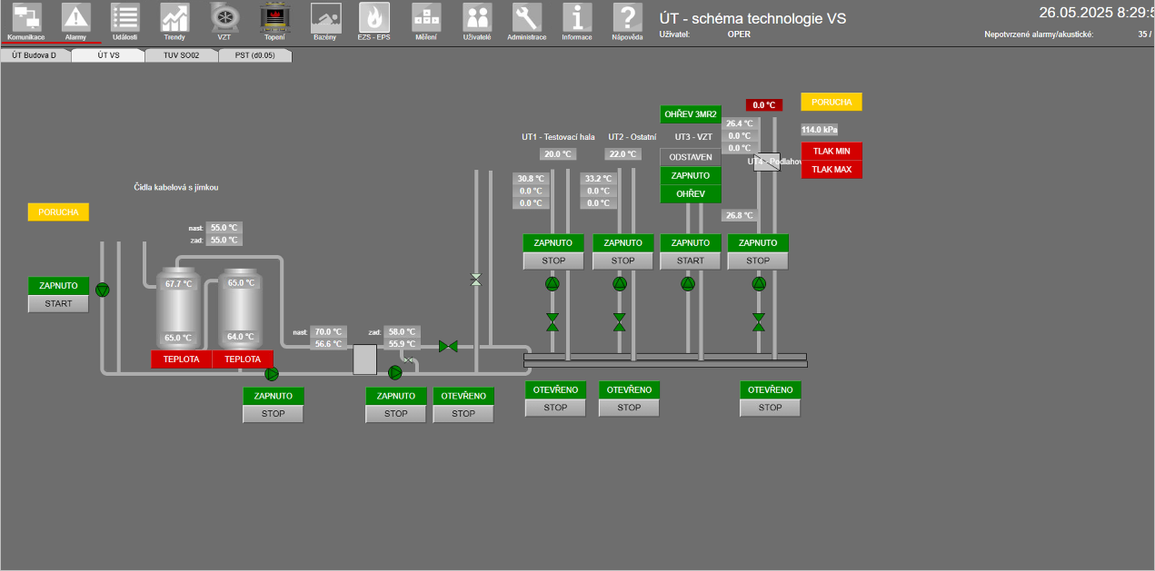 PROMOTIC provides supervision over the operation of heating systems in individual buildings of the application centre, including monitoring of current temperatures, pressures and flows in the system. The operators have access to real-time data and historical trends, allowing energy consumption to be optimised.