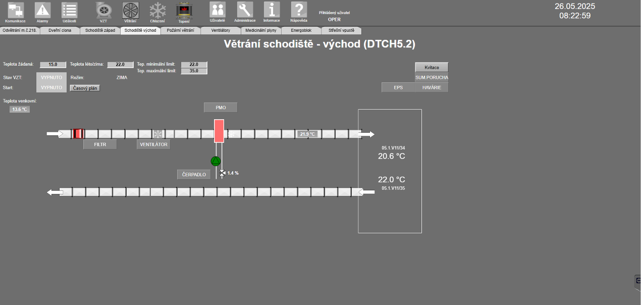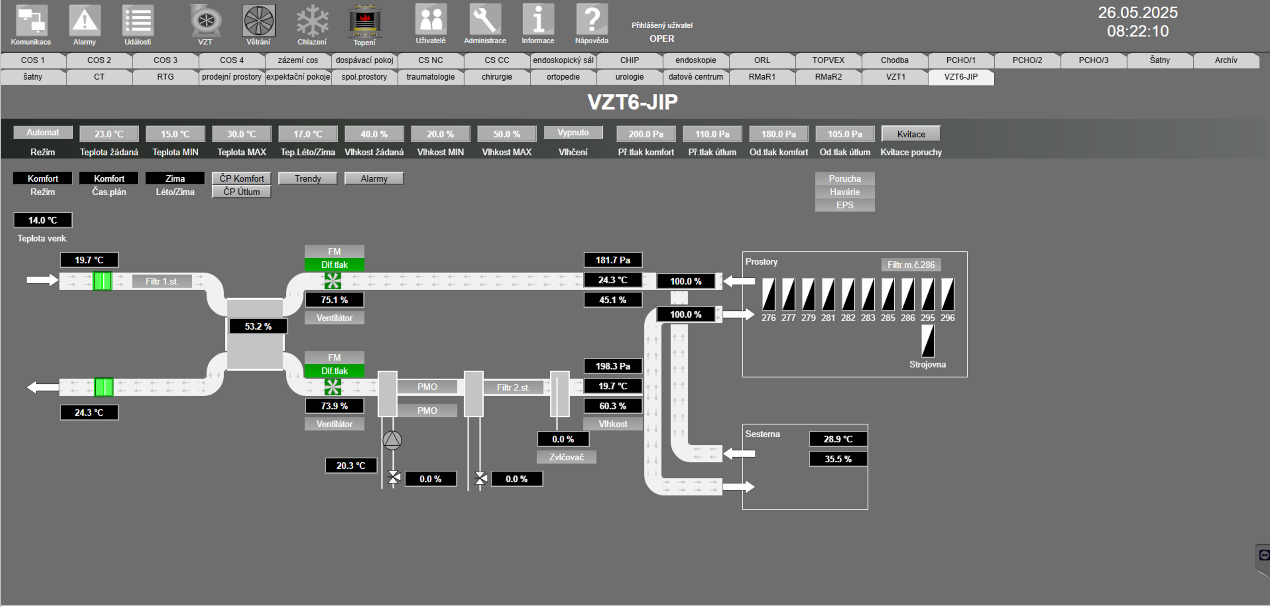 PROMOTIC provides supervision over the operation of heating systems in individual hospital buildings, including monitoring of current temperatures, pressures and flows in the system. The operators have access to real-time data and historical trends, allowing energy consumption to be optimised.