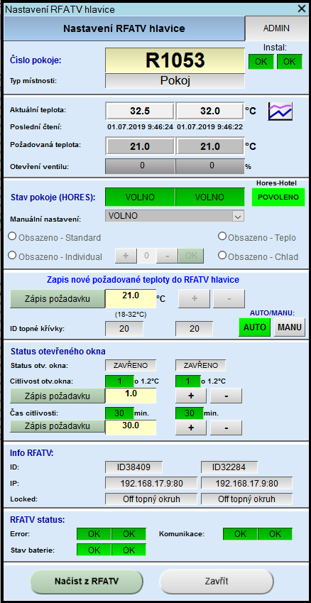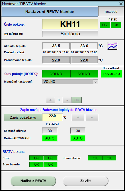 - Obsługa (recepcja) posiada również możliwość ustawienia temperatur bezpośrednio z recepcji dla wybranego pokoju