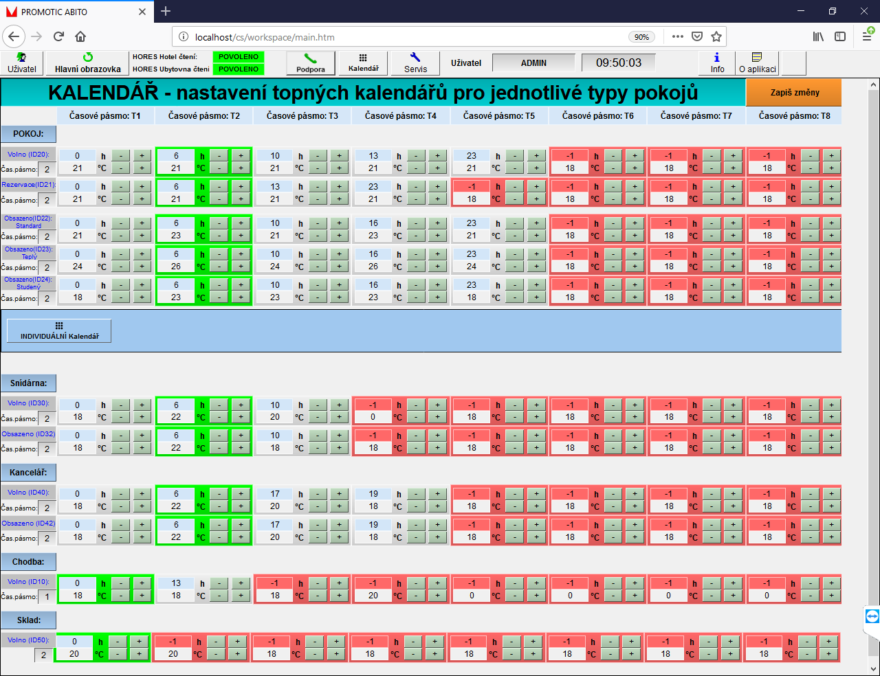 - Ustawienie wymaganych temperatur w pokojach wykonuje obsługa wyborem z wielu predefiniowanych programów czasowych: