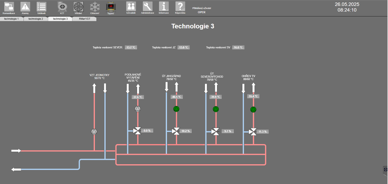 Interfejs użytkownika systemu PROMOTIC umożliwia wizualizację wszystkich sterowanych technologii w przejrzystej formie graficznej. Poprzez zabezpieczony zdalny dostęp można system monitorować oraz sterować także zdalnie, np. z dyspozytorni lub urządzeń mobilnych odpowiedzialnych techników.